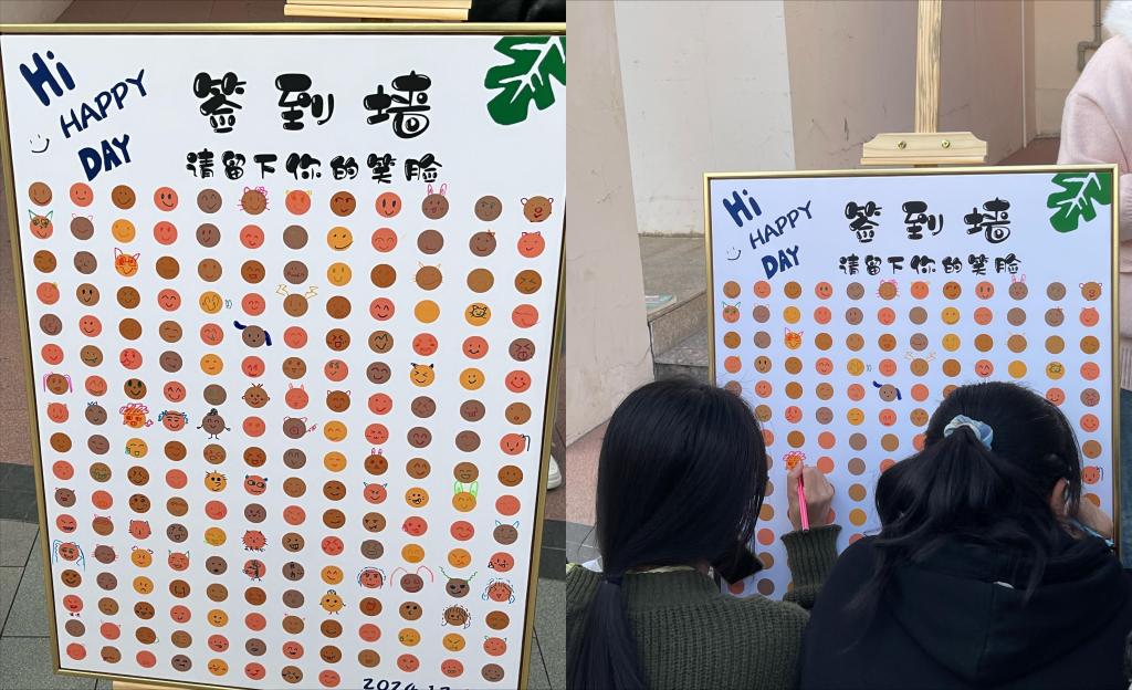 活動現場,同學們正用畫筆描繪屬于自己的燦爛笑臉。這面由200多位同學共同創作的簽到墻,見證了大學生的情緒多彩與青春活力。