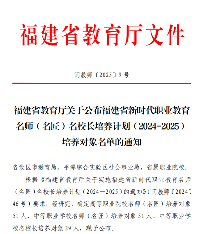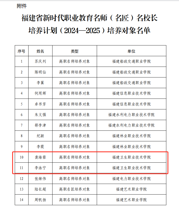 近日,福建省教育廳公布《新時代職業教育名師(名匠)名校長培養計劃(2024-2025)培養對象名單》,我校龔海蓉、李泳寧兩位教師成功入選福建省新時代職業教育高職名師培養對象。